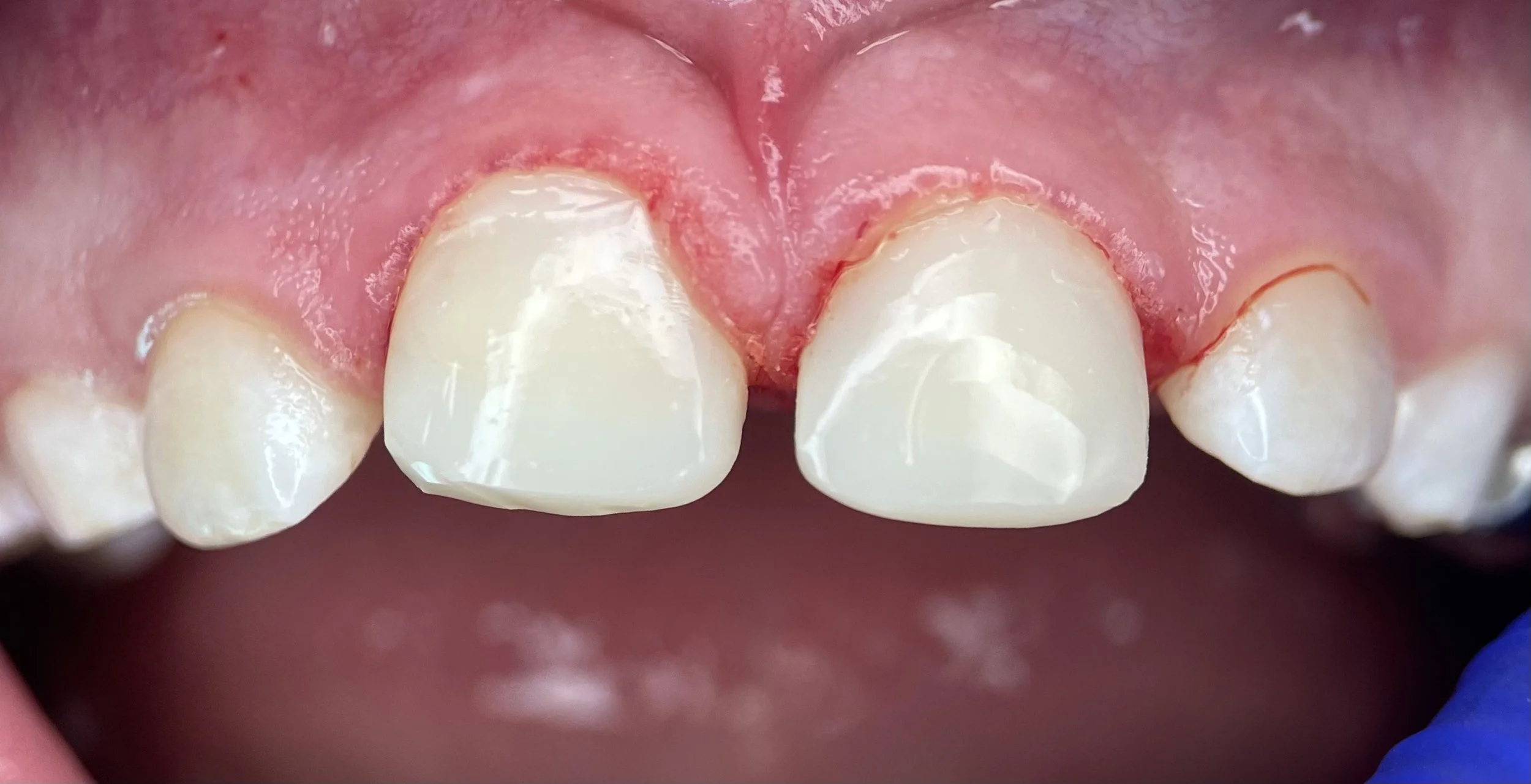 The gum tissue will heal, but crowns in this case are difficult to match adjacent teeth with moderate wear (attrition).